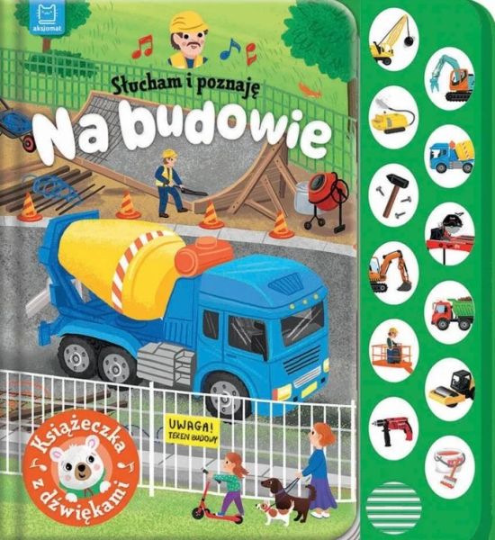 Książka dla małych majsterkowiczów i miłośników motoryzacji, a w niej bogate i staranne ilustracje oraz wierszowane historyjki o pojazdach, przedmiotach i urządzeniach na budowie. Dodatkową niespodzianką dla dzieci są dołączone dźwięki. Posłuchaj, jak brzmią: auto z kulą do wyburzania, nożyce do cięcia betonu, stacjonarna pompa do betonu, betoniarka, wbijający gwoździe młotek, piła tarczowa, koparka, wywrotka, podnośnik, walec, wiertarka i malujący pędzel. Naciśnij przycisk z obrazkiem, aby włączyć dźwięk. Chcesz wyłączyć? Naciśnij przycisk jeszcze raz. Zabawa z książką rozwija zmysły malucha. Wesołe i łatwe do zapamiętania wierszyki rozwijają pamięć i percepcję dziecka, które wzbogaca również swoją wiedzę o odgłosy wydawane przez pokazane w książce pojazdy i przedmioty. Twarda oprawa i kartonowe karty sprawiają, że książka jest trwała i bezpieczna, a format odpowiedni dla małego dziecka. Do czytania, słuchania i oglądania! [opis wydawcy].